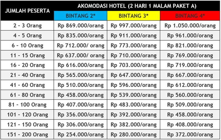 Harga untuk semua paket tour di atas adalah harga /orang dengan minimum peserta adalah 2 orang. Bayi umur kurang dari 3 tahun free, 3-5 tahun 50%, 6-7 tahun 75%, 8 tahun 100%
